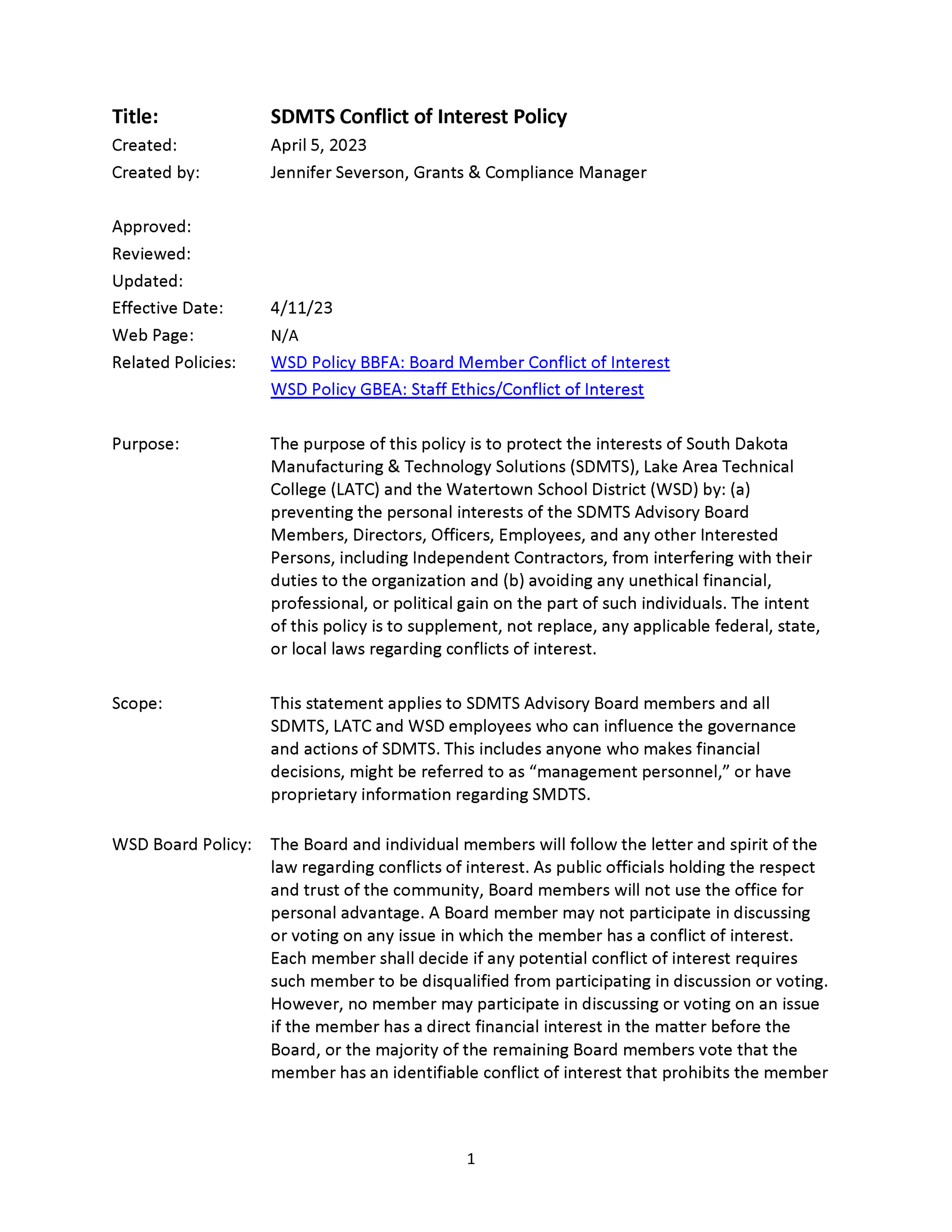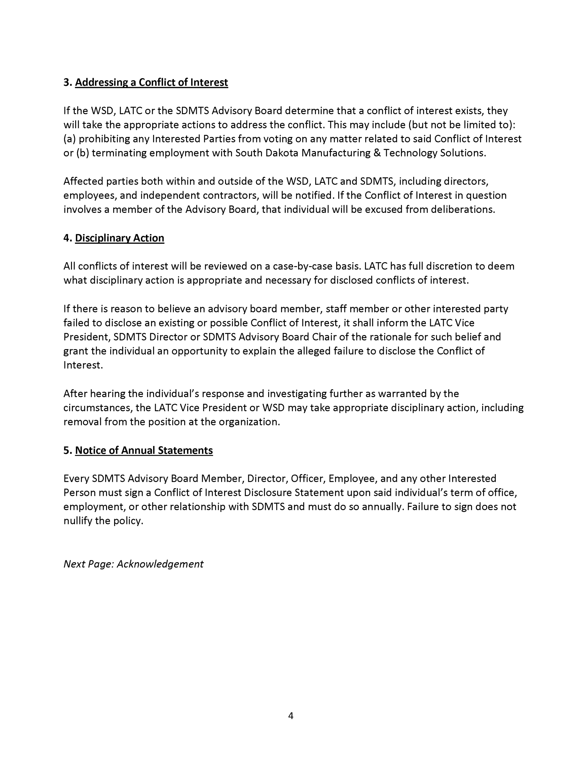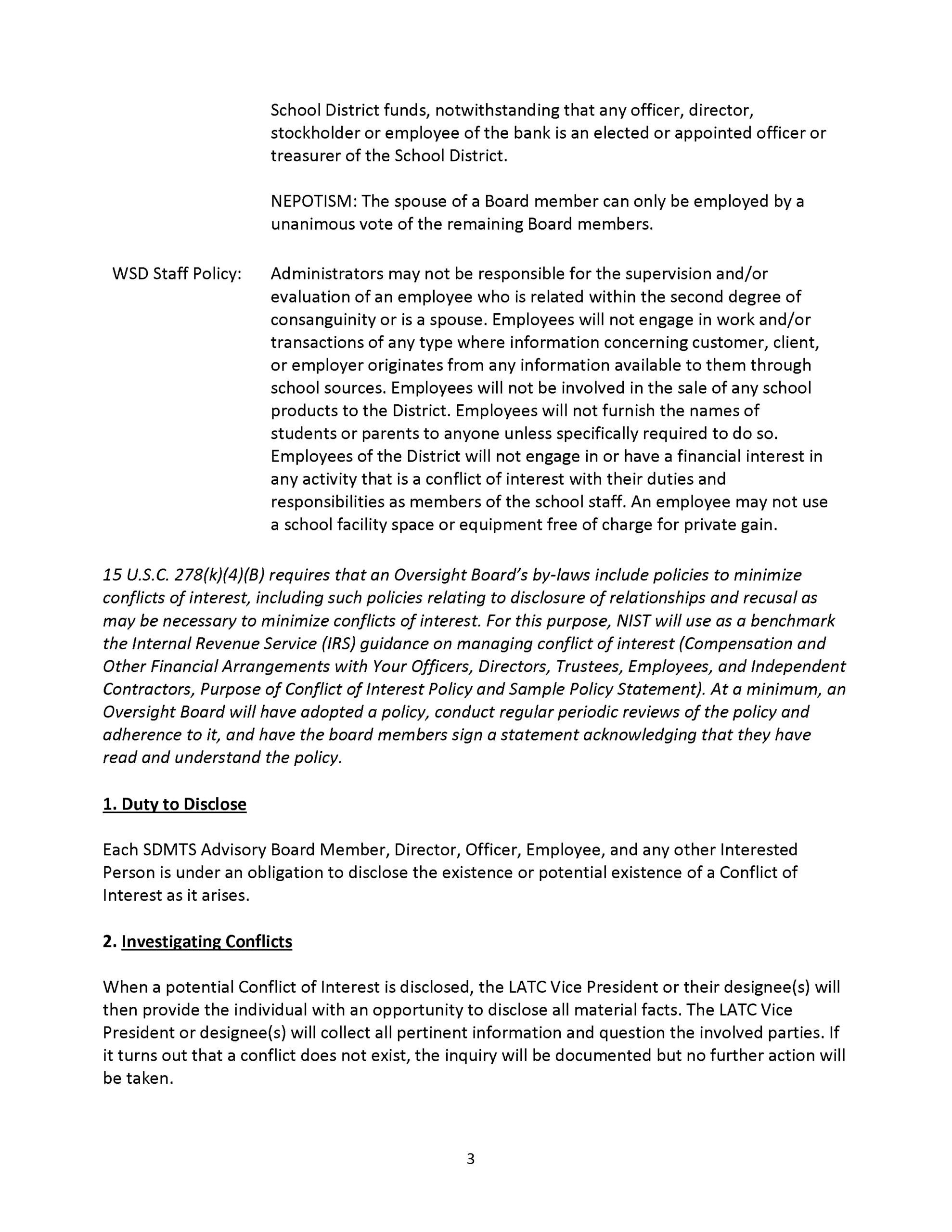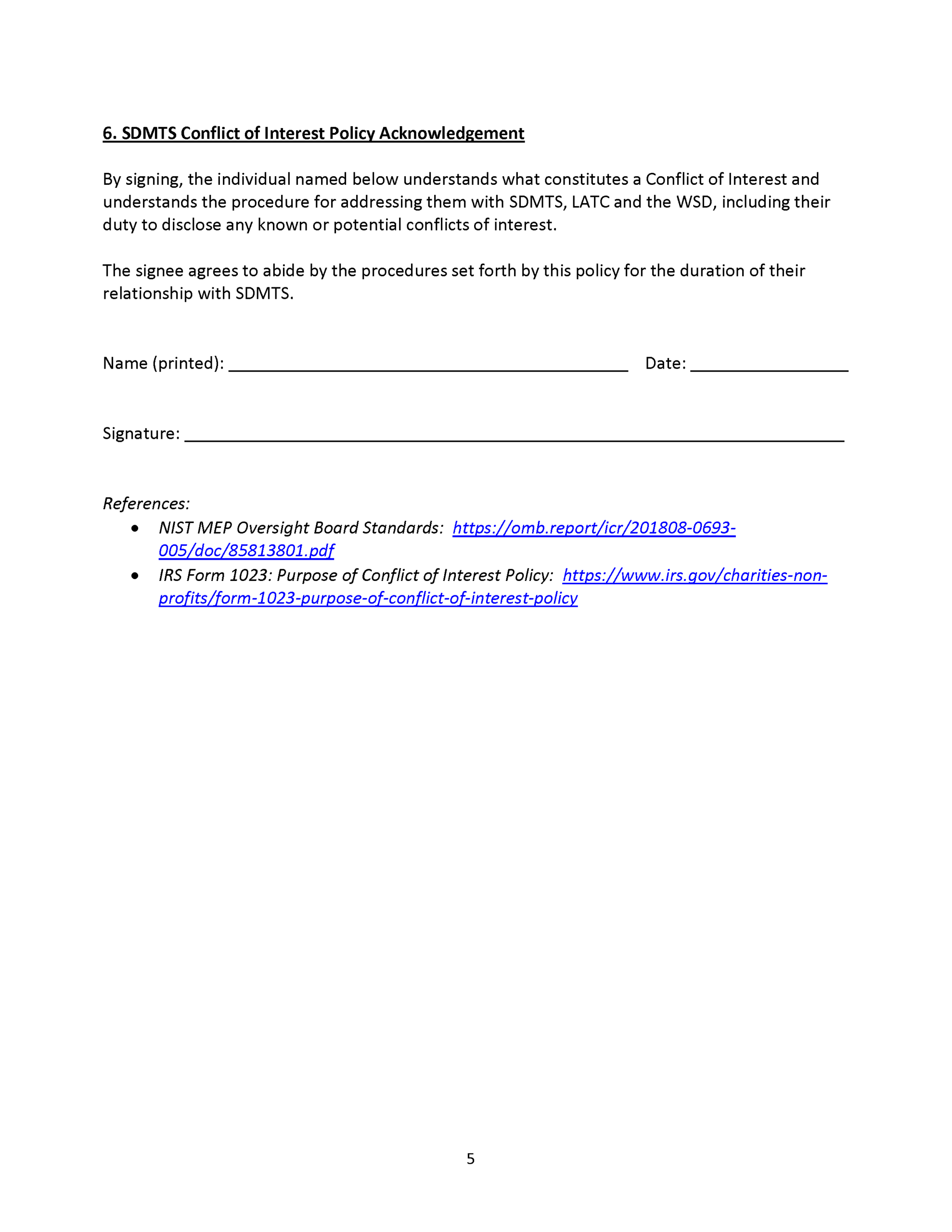 By signing, the individual named below understands what constitutes a Conflict of Interest and understands the procedure for addressing them with SDMTS, LATC and the WSD, including their duty to disclose any known or potential conflicts of interest. The signee agrees to abide by the procedures set forth by this policy for the duration of their relationship with SDMTS.